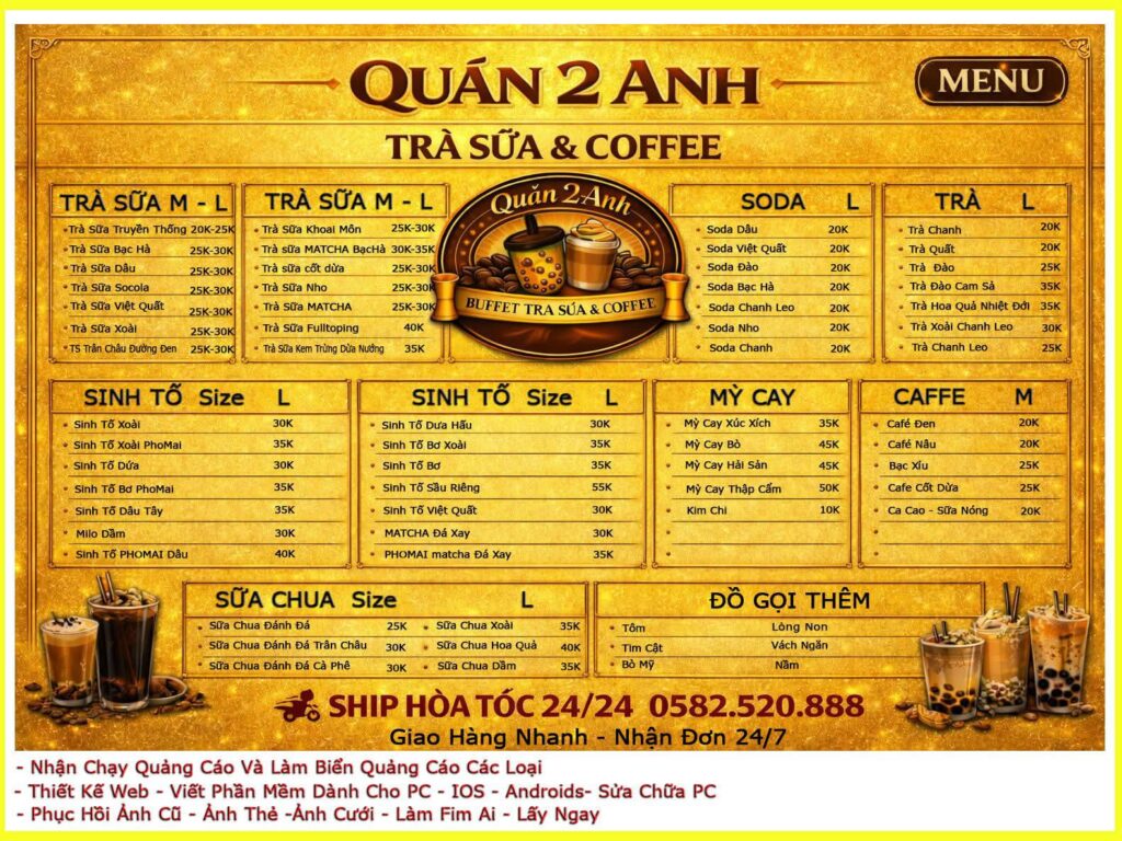 ĂN THẢ GA – KHÔNG LO VỀ GIÁ QUÁN 2 ANH BUFFET TRÀ SỮA & COFFEE Thiên đường buffet trà sữa, cà phê và lẩu viên chiên hấp dẫn. Nguyên liệu tươi mới mỗi ngày – không giới hạn thời gian. Không gian trẻ trung, thoải mái – phù hợp bạn bè & gia đình.ĐỊA CHỈ : KHU 1 ĐỐI DIỆN QUÁN THUỐC 102 – GẦN CẦU KHU 5